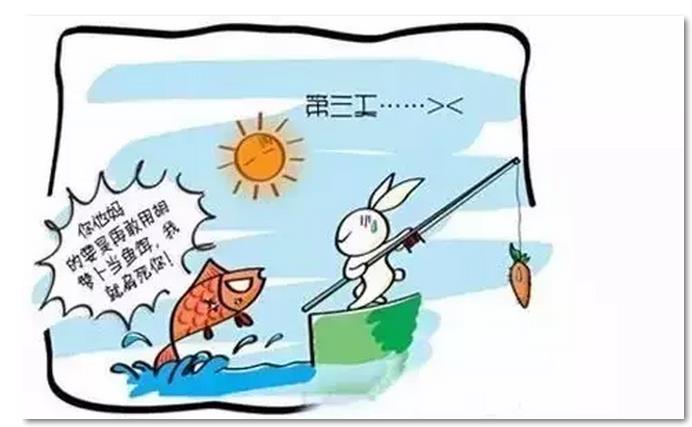 第一天,小白兔去钓鱼,一无所获。第二天,它又去钓鱼,还是如此。第三天它刚到,一条大鱼从河里跳出来,大叫:你要是再敢用胡萝卜当鱼饵,我就扁死你。