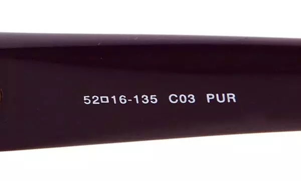 比如说这款眼镜它标注尺寸的方式就是以三个数字来呈现的,这款镜腿身上的数字是52口16 - 135,那这三个数字分别代表什么呢?其中,52代表的就是单个镜框的一个长度;16则代表眼镜中梁的一个长度;135是代表整只镜腿的长度。